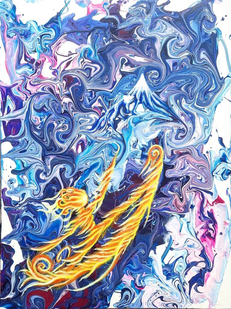 When I look at the art Charlotte created for this song, I see a being surfing on fire through a mountain of water and dreams. The theme of duality is still present, as water and fire are often thought to be ‘opposite elements’. The mountain may symbolise a mountain to be overcome, a metaphor for the ever present task of overcoming one’s past, and one’s self — often through acceptance.