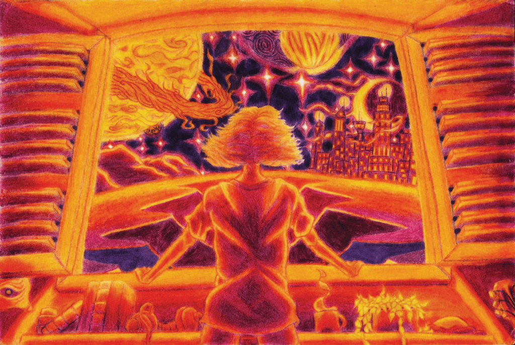 Charlottes art below brilliantly captures the feeling or idea of being born a new, as perhaps a super natural or ethereal being. This is what it feels like to find yourself. It feels like tapping into a deep knowing or divinity that you could never place your finger on, though intuitively knew that you had within you all along. Notice the multiple layers of duality in the protagonists hands, and in the sky in the background. I like the trees, reminiscient of OSRS.