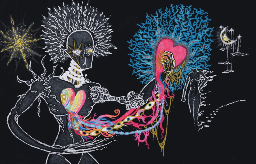 One appreciating the artwork below could appreciate the dissonance and pain experienced by someone in the process of introspection — * a mechanical logical mind built for puzzle solving and imagination attempting to understand (and control) the irrational emotional heart / reptilian brain designed for survival and reproduction. This duality is further compounded and expressed by the reccuring theme of sun and moon in the background.